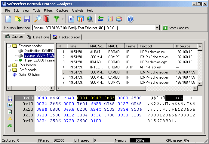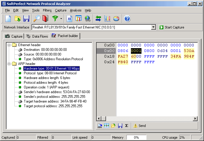 The flexible system of fully configurable filters can be used to discard all network traffic except the specific traffic patterns you wish to analyze. SoftPerfect Network Protocol Analyzer also has a special packet builder. This tool allows you to build your own custom network packets and send them into the network. You could use this packet builder feature to check your network for robustness against attacks and intruders.