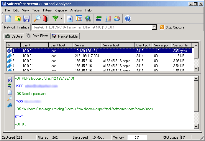 This network sniffer can reconstruct packets into flows so you can easily see a complete data exchange following the Telnet, POP3, SMTP, IMAP, FTP, HTTP and other protocols.